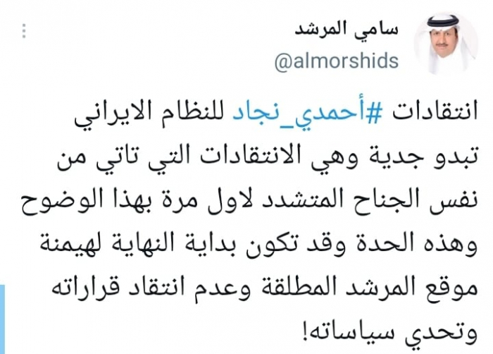 وشدد في تغريدة على حسابه بموقع التدوين المصغر تويتر، اليوم على أن: "انتقادات أحمدي نجاد للنظام الإيراني تبدو جدية وهي الانتقادات التي تأتي من نفس الجناح المتشدد لأول مرة بهذا الوضوح وهذه الحدة".