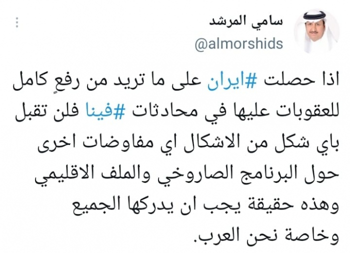 وأشار في تغريدة على حسابه بموقع التدوين المصغر تويتر، اليوم "إذا حصلت إيران على ما تريد من رفعٍ كامل للعقوبات عليها في محادثات فينا فلن تقبل بأي شكل من الأشكال أي مفاوضات أخرى حول البرنامج الصاروخي والملف الإقليمي".