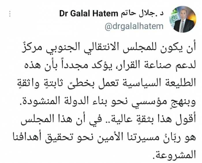 وقال في تغريدة على حسابه بموقع التدوين المصغر تويتر، اليوم: "أن يكون للمجلس الانتقالي الجنوبي مركزٌ لدعم صناعة القرار، يؤكد مجددا بأن هذه الطليعة السياسية تعمل بخطًى ثابتةٍ واثقةٍ وبنهجٍ مؤسسي نحو بناء الدولة المنشودة".