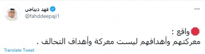 وقال في تغريدة عبر "تويتر" رصدها "المشهد العربي": "واقع: معركتهم وأهدافهم ليست معركة وأهداف التحالف".