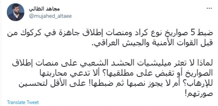 وقال في تغريدة عبر "تويتر" رصدها "المشهد العربي": "ضبط 5 صواريخ نوع كراد ومنصات إطلاق جاهزة في كركوك من قبل القوات الأمنية والجيش العراقي. لماذا لا تعثر ميليشيات الحشد الشعبي على منصات إطلاق الصواريخ أو تقبض على مطلقيها؟ ألا تدعي محاربتها للإرهاب؟ أم لا يجوز نصبها ثم ضبطها! على الأقل لتحسين صورتهم".
