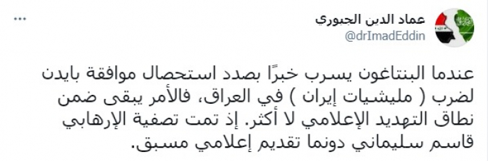 وقال في تغريدة عبر "تويتر" رصدها "المشهد العربي": "عندما البنتاغون يسرب خبرًا بصدد استحصال موافقة بايدن لضرب (مليشيات إيران) في العراق، فالأمر يبقى ضمن نطاق التهديد الإعلامي لا أكثر. إذ تمت تصفية الإرهابي قاسم سليماني دونما تقديم إعلامي مسبق".