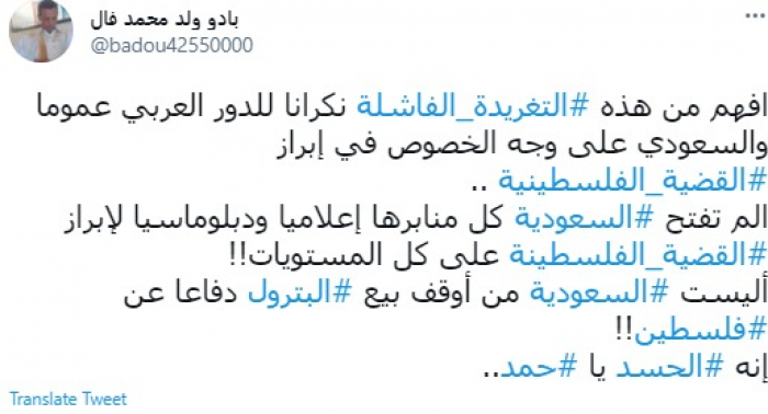 وقال في تغريدة عبر "تويتر" رصدها "المشهد العربي": "افهم من هذه التغريدة الفاشلة نكرانا للدور العربي عموما والسعودي على وجه الخصوص في إبراز القضية الفلسطينية".