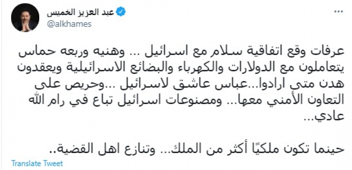 وقال في تغريدة عبر "تويتر" رصدها "المشهد العربي": "عرفات وقع اتفاقية سلام مع إسرائيل … وهنيه وربعه حماس يتعاملون مع الدولارات والكهرباء والبضائع الإسرائيلية ويعقدون هدن متى أرادوا…عباس عاشق لإسرائيل …وحريص على التعاون الأمني معها… ومصنوعات اسرائيل تباع في رام الله عادي".