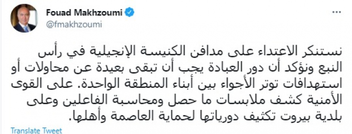 وقال في تغريدة عبر "تويتر" رصدها "المشهد العربي": "نستنكر الاعتداء على مدافن الكنيسة الإنجيلية في رأس النبع ونؤكد أن دور العبادة يجب أن تبقى بعيدة عن محاولات أو استهدافات توتر الأجواء بين أبناء المنطقة الواحدة".