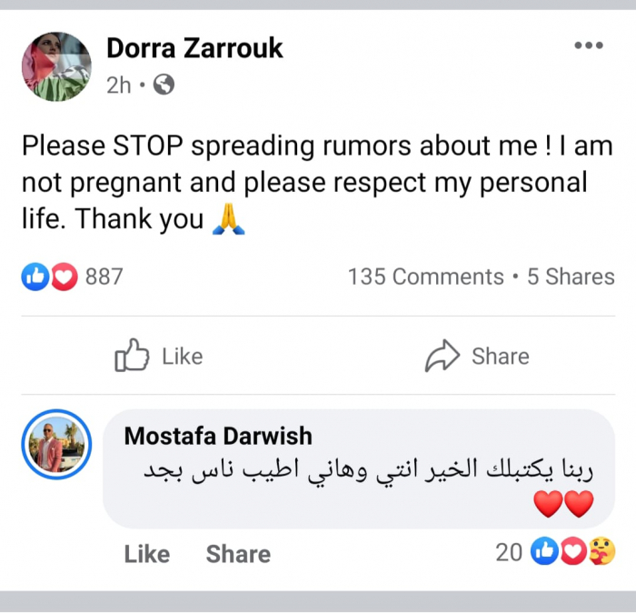 كشفت الفنانة التونسية درة زروق، حقيقة ما تردد عن حملها، عبر حسابها على "فيسبوك".