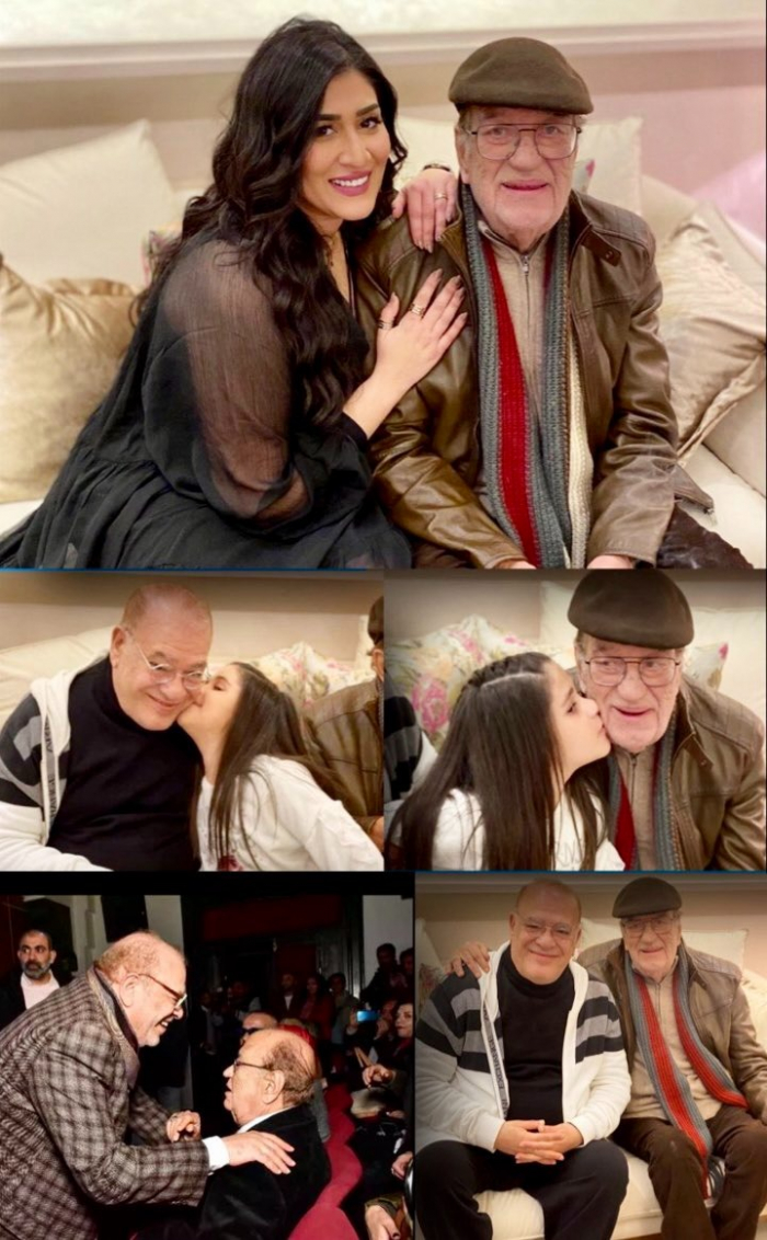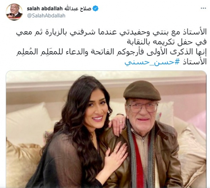 ونشر "عبدالله" صورة مجمعة في إطار واحد تجمع ابنته وحفيدته مع الفنان الراحل، عبر حسابه الرسمي بموقع "تويتر"، وعلّق: "الأستاذ مع بنتي وحفيدتي عندما شرفني بالزيارة ثم معي في حفل تكريمه بالنقابة".