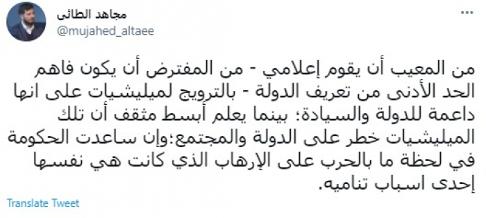 وقال في تغريدة عبر "تويتر" رصدها "المشهد العربي": "من المعيب أن يقوم إعلامي - من المفترض أن يكون فاهم الحد الأدنى من تعريف الدولة - بالترويج لميليشيات على انها داعمة للدولة والسيادة؛ بينما يعلم أبسط مثقف أن تلك الميليشيات خطر على الدولة والمجتمع؛وإن ساعدت الحكومة في لحظة ما بالحرب على الإرهاب الذي كانت هي نفسها إحدى اسباب تناميه".