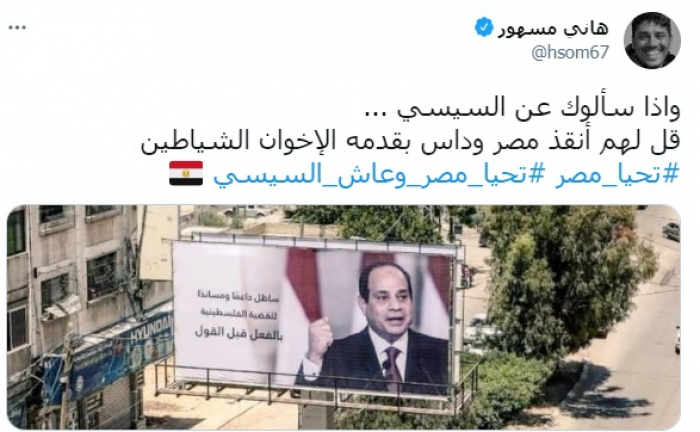 وقال في تغريدة عبر "تويتر" رصدها "المشهد العربي": "وإذا سألوك عن السيسي ... قل لهم أنقذ مصر وداس بقدمه الإخوان الشياطين".