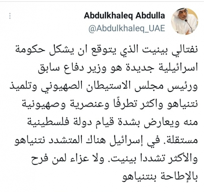 وأشار في تغريدة على حسابه بموقع التدوين المصغر تويتر، اليوم إلى أن: "نفتالي بينيت الذي يتوقع أن يشكل حكومة إسرائيلية جديدة هو وزير دفاع سابق ورئيس مجلس الاستيطان الصهيوني".