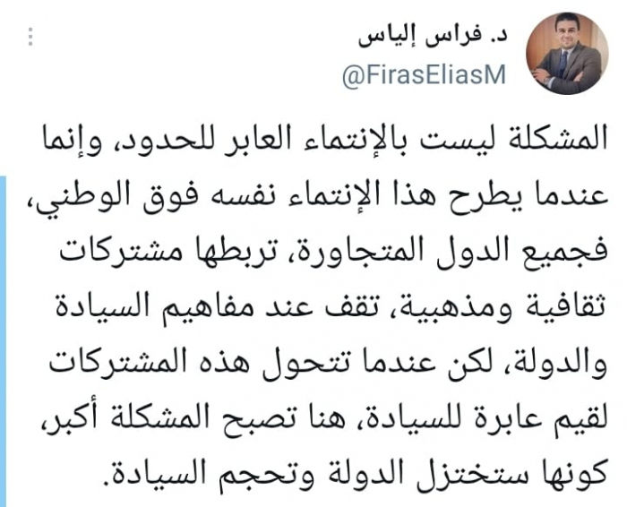 وأوضح في تغريدة على حسابه بموقع التدوين المصغر تويتر، اليوم أن: "المشكلة ليست بالانتماء العابر للحدود، وإنما عندما يطرح هذا الانتماء نفسه فوق الوطني".