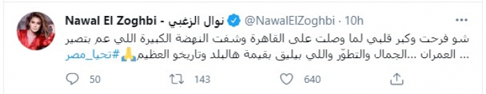 وكتبت "نوال" عبر حسابها الرسمي بموقع "تويتر: "شو فرحت وكبر قلبي لما وصلت على القاهرة وشفت النهضة الكبيرة اللي عم بتصير، العمران، الجمال والتطور واللي بيليق بقيمة هالبلد وتاريخه العظيم".