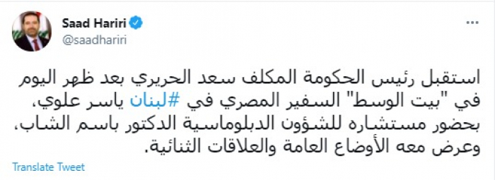 وقال في تغريدة عبر "تويتر" رصدها "المشهد العربي": "استقبل رئيس الحكومة المكلف سعد الحريري بعد ظهر اليوم في بيت الوسط السفير المصري في لبنان ياسر علوي، بحضور مستشاره للشؤون الدبلوماسية الدكتور باسم الشاب، وعرض معه الأوضاع العامة والعلاقات الثنائية".