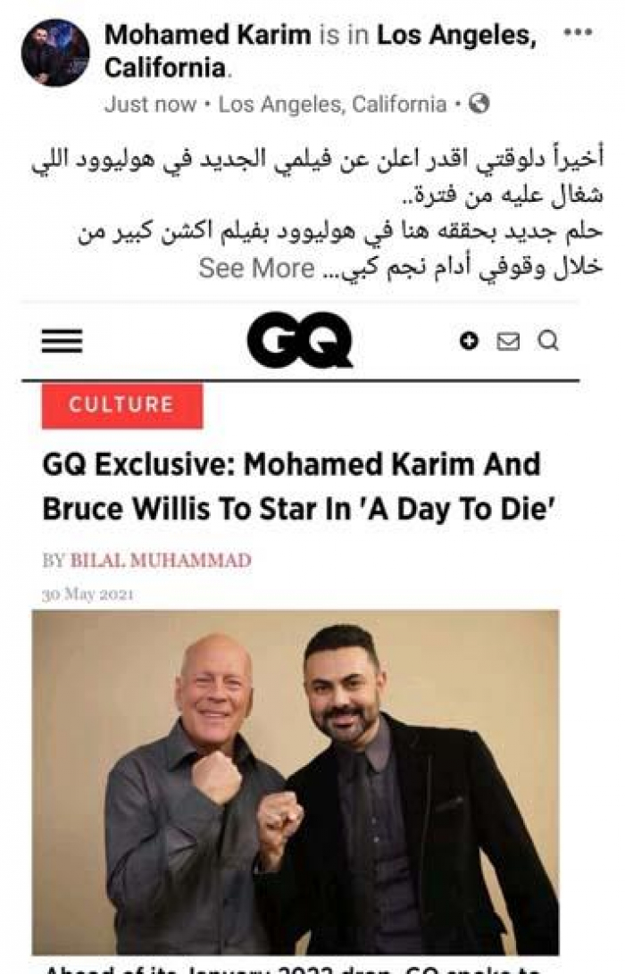 أعلن الفنان المصري محمد كريم، عن مشاركته في بطولة فيلم جديد بهوليوود، يجمعه بالفنان العالمي ونجم الأكشن بروس ويليس، ويحمل اسم "a day to die".