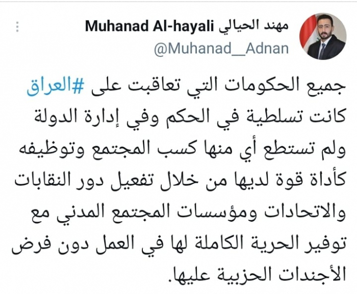 وأوضح في تغريدة على حسابه بموقع التدوين المصغر تويتر، اليوم أن: "جميع الحكومات التي تعاقبت على العراق كانت تسلطية في الحكم وفي إدارة الدولة".