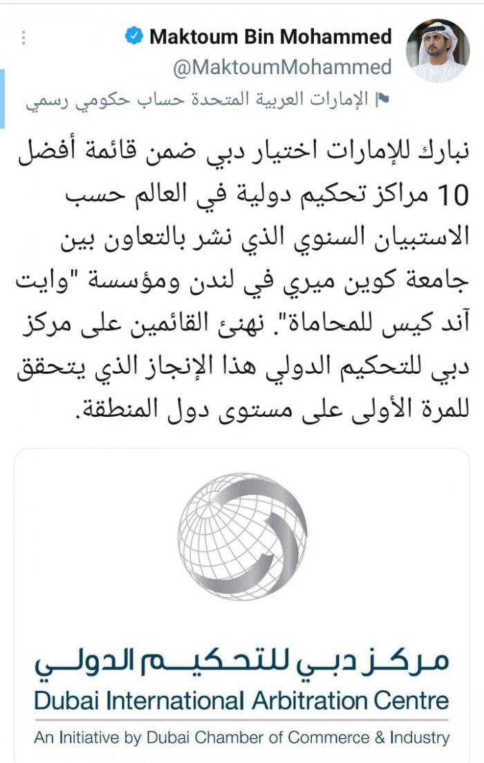 وقال في تغريدة على حسابه بموقع التدوين المصغر تويتر، اليوم إننا: "نبارك للإمارات اختيار دبي ضمن قائمة أفضل 10 مراكز تحكيم دولية في العالم حسب الاستبيان السنوي الذي نشر بالتعاون بين جامعة كوين ميري في لندن ومؤسسة (وايت آند كيس للمحاماة).