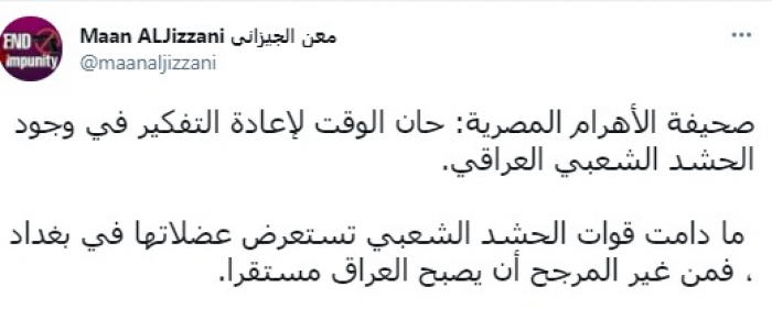 وقال في تغريدة عبر "تويتر" رصدها "المشهد العربي": "صحيفة الأهرام المصرية: حان الوقت لإعادة التفكير في وجود الحشد الشعبي العراقي. ما دامت قوات الحشد الشعبي تستعرض عضلاتها في بغداد ، فمن غير المرجح أن يصبح العراق مستقرا".