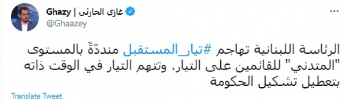 وقال في تغريدة عبر "تويتر" رصدها "المشهد العربي": "الرئاسة اللبنانية تهاجم تيار المستقبل منددّةً بالمستوى المتدني للقائمين على التيار، وتتهم التيار في الوقت ذاته بتعطيل تشكيل الحكومة".