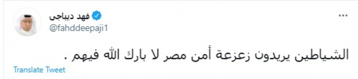 وقال في تغريدة عبر "تويتر" رصدها "المشهد العربي": "الشياطين يريدون زعزعة أمن مصر لا بارك الله فيهم".