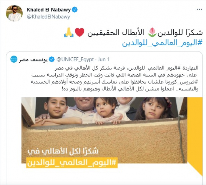 وكتب "النبوي" تغريدة، عبر حسابه الرسمي بموقع "تويتر": "شكرًا للوالدين، الأبطال الحقيقيون".