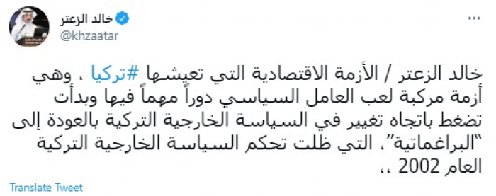 وقال في تغريدة عبر "تويتر" رصدها "المشهد العربي": "الأزمة الاقتصادية التي تعيشها تركيا ، وهي أزمة مركبة لعب العامل السياسي دوراً مهماً فيها وبدأت تضغط باتجاه تغيير في السياسة الخارجية التركية بالعودة إلى البراغماتية التي ظلت تحكم السياسة الخارجية التركية العام 2002".
