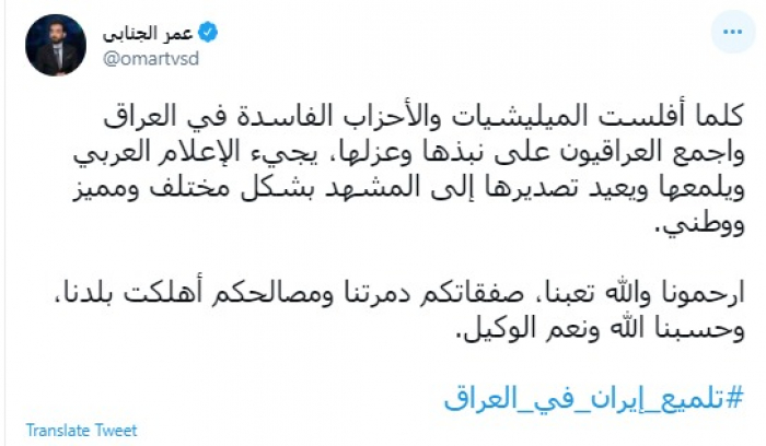 وقال في تغريدة عبر "تويتر" رصدها "المشهد العربي": "كلما أفلست الميليشيات والأحزاب الفاسدة في العراق واجمع العراقيون على نبذها وعزلها، يجيء الإعلام العربي ويلمعها ويعيد تصديرها إلى المشهد بشكل مختلف ومميز ووطني. ارحمونا والله تعبنا، صفقاتكم دمرتنا ومصالحكم أهلكت بلدنا، وحسبنا الله ونعم الوكيل. تلميع إيران في العراق".