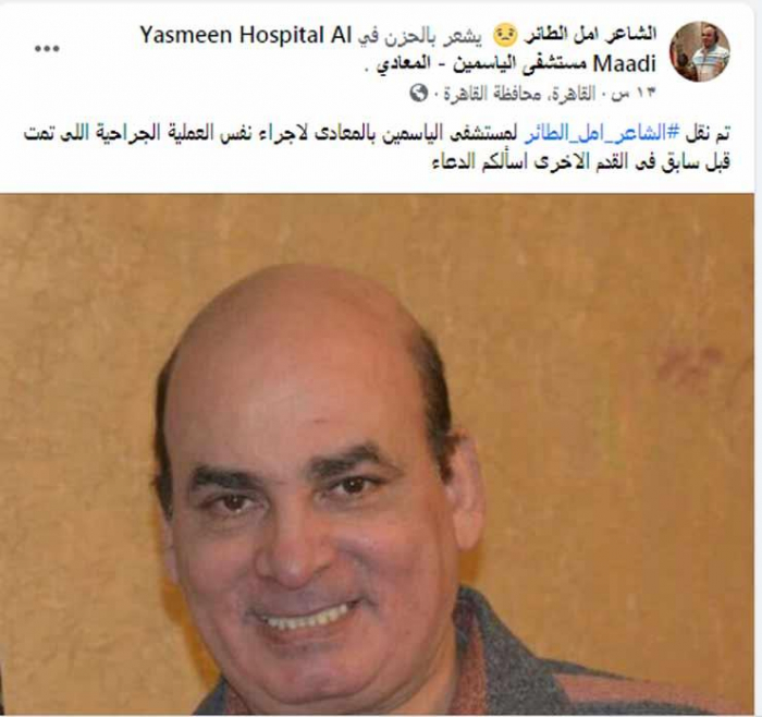 وأعلنت زوجة أمل مساء أمس عن نقله إلى إحدى المستشفيات في المعادي، وكتبت " تم نقل الشاعر أمل الطائر لمستشفى الياسمين بالمعادي لإجراء نفس العملية الجراحية اللي تمت قبل سابق في القدم الأخرى أسألكم الدعاء".