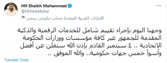 وقال في تغريدة عبر "تويتر" رصدها "المشهد العربي": "وجهنا اليوم بإجراء تقييم شامل للخدمات الرقمية والذكية المقدمة للجمهور عبر كافة مؤسسات ووزارات الحكومة الاتحادية .. ٤ سبتمبر القادم بإذن الله سنعلن عن أفضل وأسوأ خمس جهات حكومية.. والله الموفق".