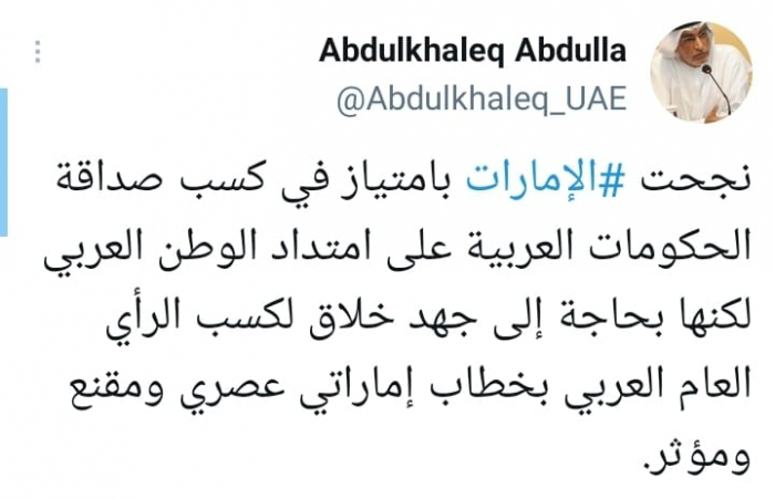 وشدد في تغريدة على حسابه بموقع التدوين المصغر تويتر، اليوم على أنه: "نجحت الإمارات بامتياز في كسب صداقة الحكومات العربية على امتداد الوطن العربي".