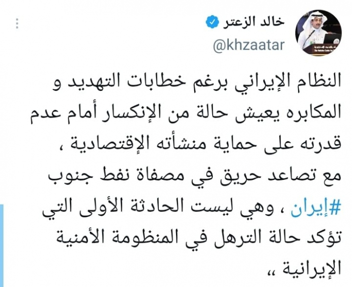 وشدد في تغريدة على حسابه بموقع التدوين المصغر تويتر، اليوم على أن: "النظام الإيراني برغم خطابات التهديد والمكابرة يعيش حالة من الانكسار أمام عدم قدرته على حماية منشآته الاقتصادية".