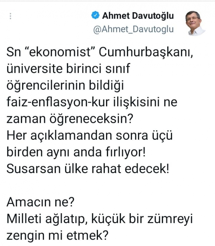 هاجم السياسي التركي البارز أحمد داوود أوغلو، الرئيس رجب طيب أردوغان، مؤكدا أن أسعار الفائدة ومعدلات التضخم وأسعار الصرف تقفز بعد خطاباته.