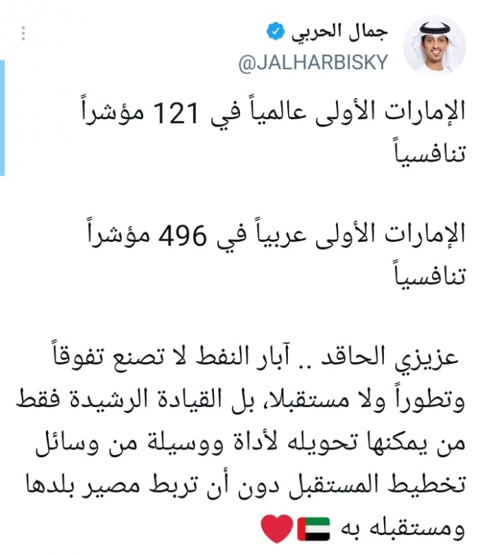 أكد الإعلامي جمال الحربي، أن دولة الإمارات العربية المتحدة، تتصدر المئات من مؤشرات التنمية عالميا وعربيا.