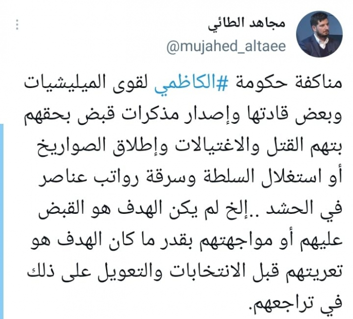 وقال في تغريدة على حسابه بموقع التدوين المصغر تويتر، اليوم إن: "مناكفة حكومة الكاظمي لقوى الميليشيات وبعض قادتها وإصدار مذكرات قبض بحقهم بتهم القتل والاغتيالات وإطلاق الصواريخ أو استغلال السلطة وسرقة رواتب عناصر في الحشد، إلخ لم يكن الهدف هو القبض عليهم أو مواجهتهم".
