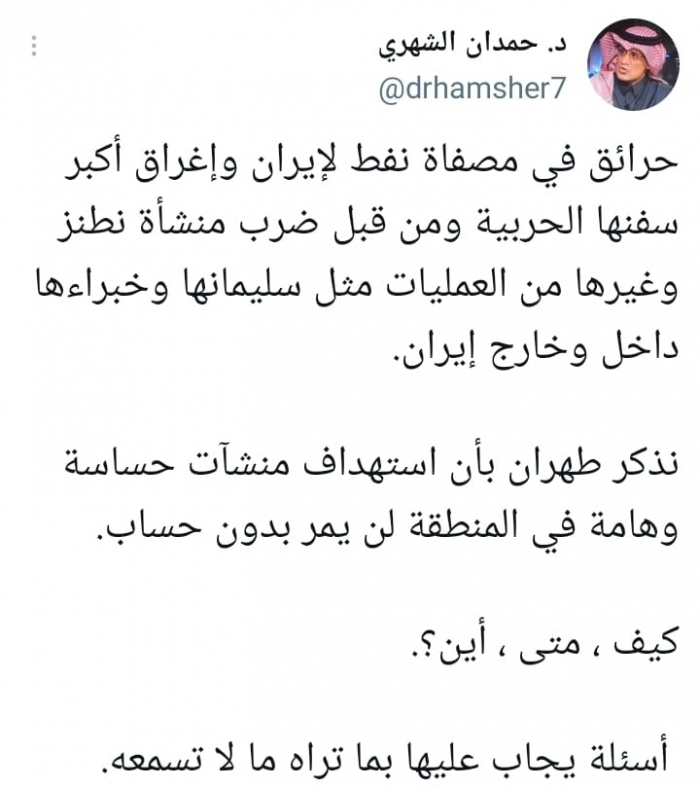 وأوضح في تغريدة على حسابه بموقع التدوين المصغر تويتر، اليوم أن هناك: "حرائق في مصفاة نفط لإيران وإغراق أكبر سفنها الحربية ومن قبل ضرب منشأة نطنز وغيرها من العمليات مثل سليمانها وخبراءها داخل وخارج إيران".
