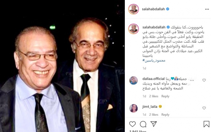 ونشر "صلاح" صورة تجمعهما، عبر حسابها الرسمي بموقع "إنستجرام"، وعلق: "يا حوت، كنا بنقولك ياحوت.. وكنت فعلاً في الفن حوت.. بس في الحقيقة يابو أحلى صوت.. وأحلى طلة.. يابو قلب فُلة.. كنت مضرب المثل للكتير .. في البساطة والتواضع مع الصغير قبل الكبير.. عيد ميلادك في الجنة بإذن المولى ياحبيبنا".
