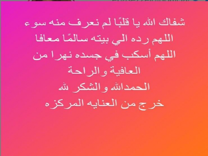 وكتبت: "شفاك الله يا قلبا لم نعرف منه سوء، اللهم رده إلى بيته سالما معافا، اللهم اسكب في جسده نهرا من العافية والراحة، الحمد لله والشكر لله خرج من العناية المركزة".