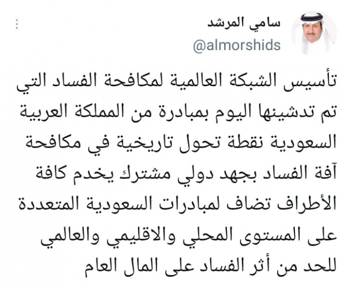 شدد المحلل السياسي السعودي سامي المرشد، على أن تأسيس الشبكة العالمية لمكافحة الفساد، نقطة تحول تاريخية بقيادة المملكة العربية السعودية.