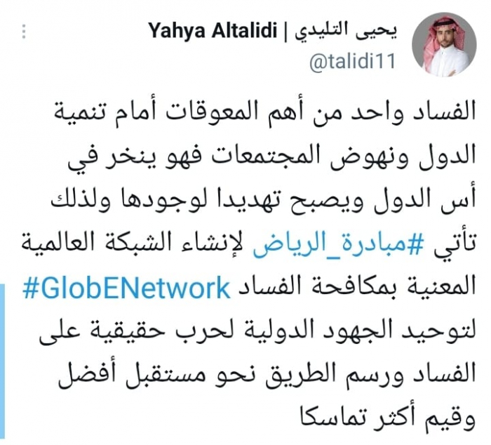 وأوضح أنه: "لذلك تأتي مبادرة الرياض لإنشاء الشبكة العالمية المعنية بمكافحة الفساد لتوحيد الجهود الدولية لحرب حقيقية على الفساد ورسم الطريق نحو مستقبل أفضل وقيم أكثر تماسكا".
