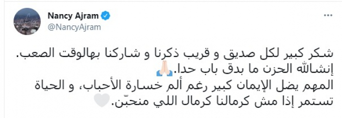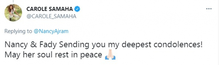 وكتبت كارول، عبر حسابها على تويتر :"نانسي، فادي أبعث لكما أحر التعازي.. لترتاح روحها بسلام".