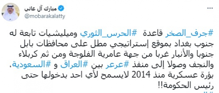 وكتب في تغريدة عبر "تويتر" رصدها "المشهد العربي": "جرف الصخر قاعدة الحرس الثوري وميليشيات تابعة له جنوب بغداد بموقع إستراتيجي مطل على محافظات بابل جنوبا والأنبار غربا من جهة عامرية الفلوجة ومن ثم كربلاء والنجف وصولا إلى منفذ عرعر بين العراق والسعودية".