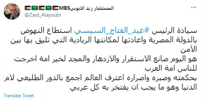 وقال في تغريدة عبر "تويتر" رصدها "المشهد العربي": "سيادة الرئيس عبد الفتاح السيسي استطاع النهوض بالدولة المصرية وإعادتها لمكانتها الريادية التي تليق بها بين الآمن هو اليوم صانع الاستقرار والازدهار والمجد لخير أمة أخرجت للناس أمة العرب".