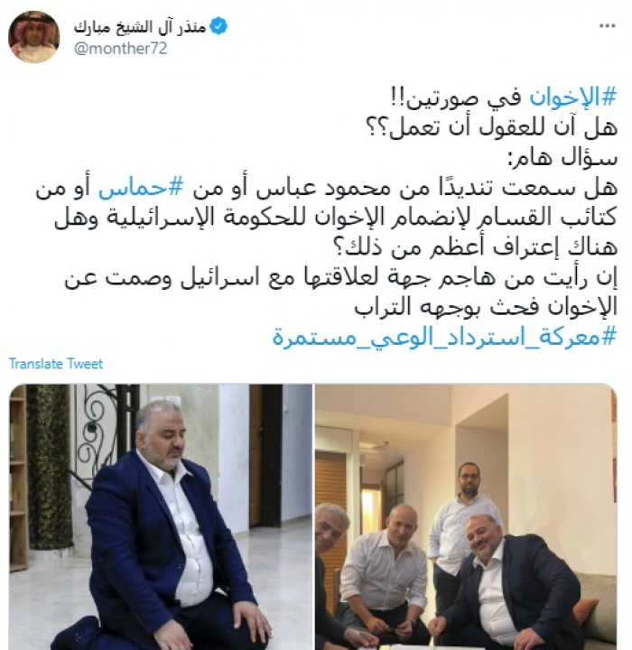 علق المدون السعودي البارز منذر آل الشيخ مبارك، اليوم، على أفعال قيادات جماعة الإخوان بالتقرب من رموز الحكم في إسرائيل.
