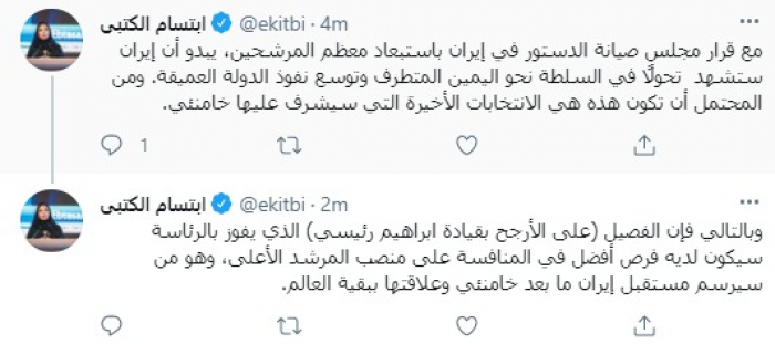 وقالت في تغريدات عبر "تويتر" رصدها "المشهد العربي": "مع قرار مجلس صيانة الدستور في إيران باستبعاد معظم المرشحين، يبدو أن إيران ستشهد تحولًا في السلطة نحو اليمين المتطرف وتوسع نفوذ الدولة العميقة. ومن المحتمل أن تكون هذه هي الانتخابات الأخيرة التي سيشرف عليها خامنئي".