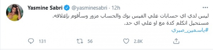 وكتبت ياسمين، عبر حسابها على تويتر: "ليس لدي أي حسابات على الفيس بوك، والحساب مزور، وسأقوم بإغلاقه.. مستحيل أتكلم كدة مع أو على أي حد" .