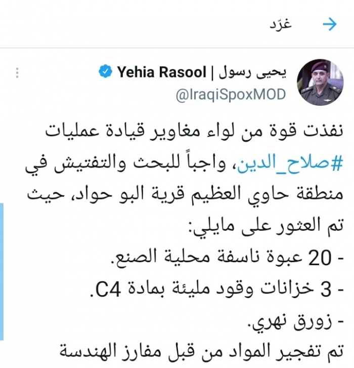 وأكد في تغريدة على حسابه بموقع التدوين المصغر تويتر، اليوم أنه: "نفذت قوة من لواء مغاوير قيادة عمليات صلاح الدين، واجباً للبحث والتفتيش في منطقة حاوي العظيم قرية البو حواد".