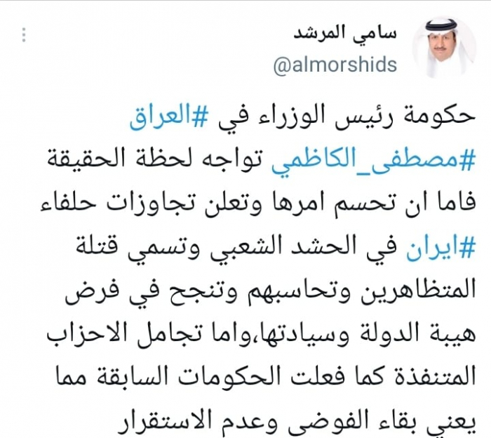 رأى المحلل السياسي السعودي سامي المرشد، أن الحكومة العراقية مطالبة بكشف تجاوزات مليشيات إيران ومحاسبتها.
