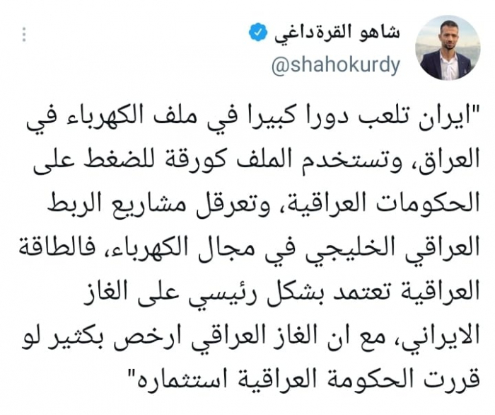 وأكد في تغريدة على حسابه بموقع التدوين المصغر تويتر، اليوم أن: ""إيران تلعب دورا كبيرا في ملف الكهرباء في العراق، وتستخدم الملف كورقة للضغط على الحكومات العراقية".