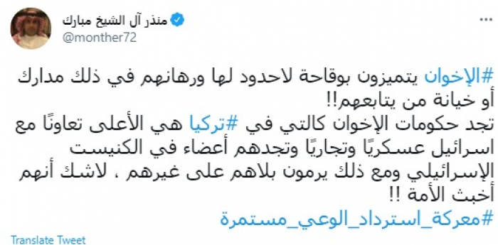 هاجم المدون السعودي البارز منذر آل الشيخ مبارك، اليوم، جماعة الإخوان جراء تناقضها بالمتاجرة بالقضية الفلسطينية وفي الوقت ذاته تسعى للوصول إلى الكنيست الإسرائيلي – في إشارة لمنصور عباس-.