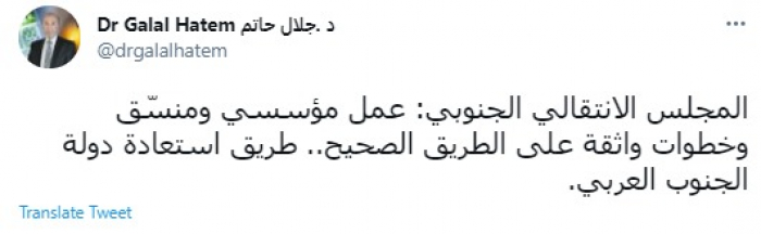 وقال في تغريدة عبر "تويتر" رصدها "المشهد العربي": "المجلس الانتقالي الجنوبي: عمل مؤسسي ومنسّق وخطوات واثقة على الطريق الصحيح.. طريق استعادة دولة الجنوب العربي".