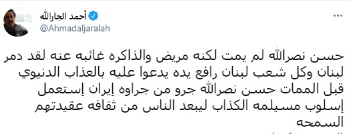 وقال في تغريدة عبر "تويتر" رصدها "المشهد العربي": "حسن نصرالله لم يمت لكنه مريض والذاكرة غائبة عنه لقد دمر لبنان".